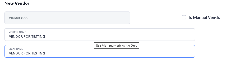 > For Vendor Name and Legal Name please type here like this.