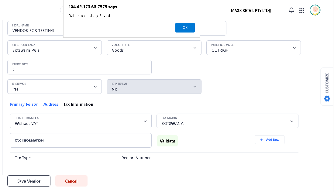 > After fill all the details, then click on Save Vendor option to Save the Vendor.