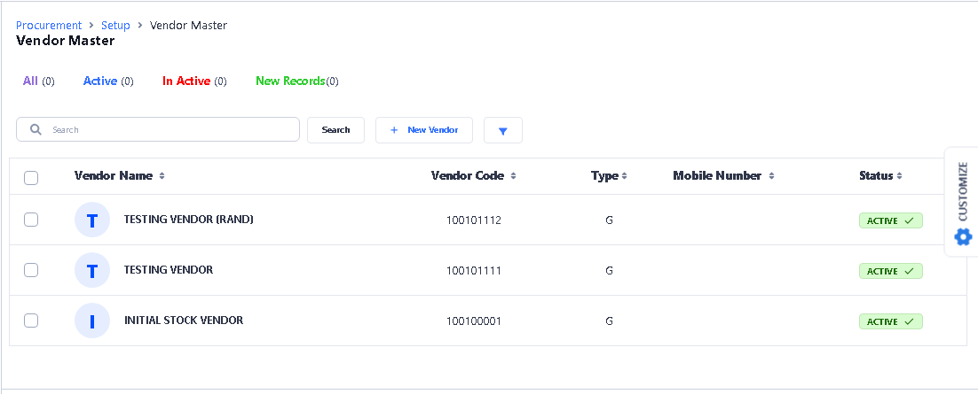 • Click on Vendor Master function and a list of all existing vendors will appear, click on any vendor to edit it or you can click on NEW VENDOR Button to create a new vendor.