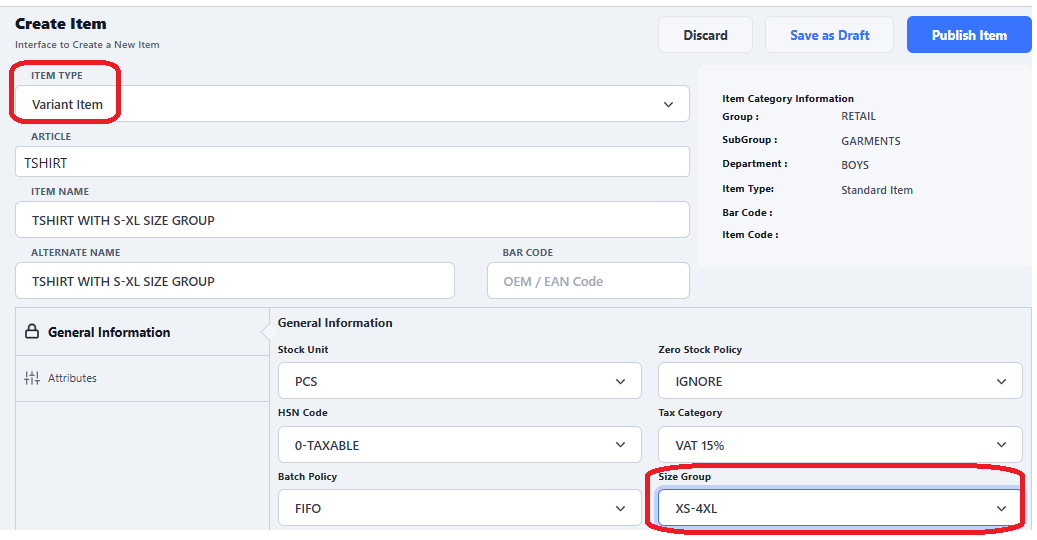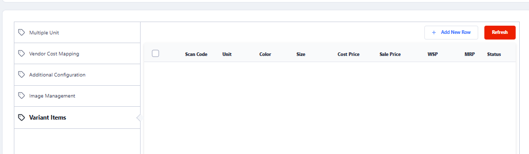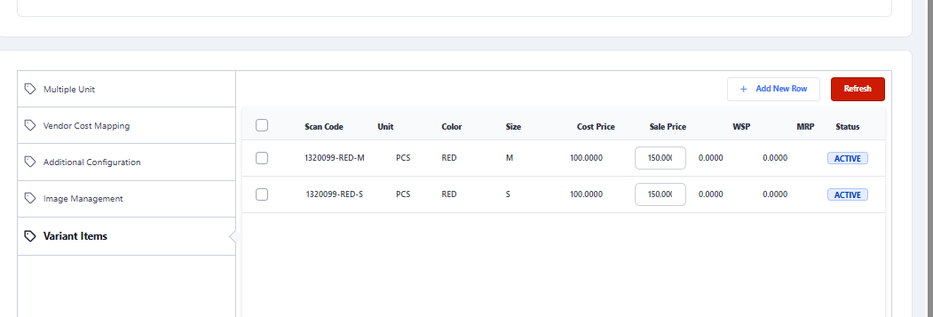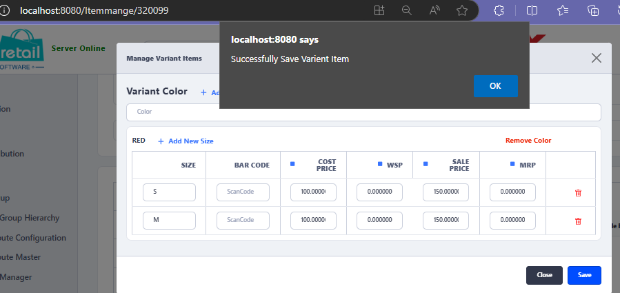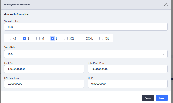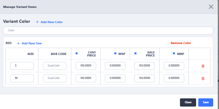 Also, if required can define different cost, sale price for each color and each size as per requirement. - Clock on Add New Size to add further sizes according to your requirement, then click on Save button to add variants under the defined item.