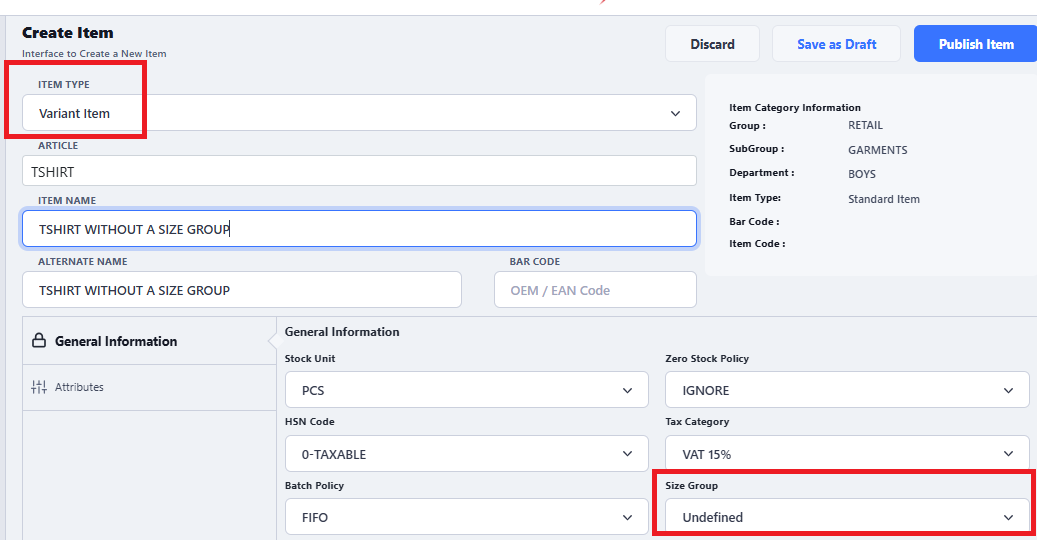 - Option2: Create an item without a size group