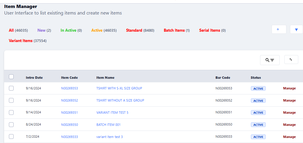 After item is created it will be visible in list of item manager where we can click on manage item and add variants e.g. color and sizes according to requirement