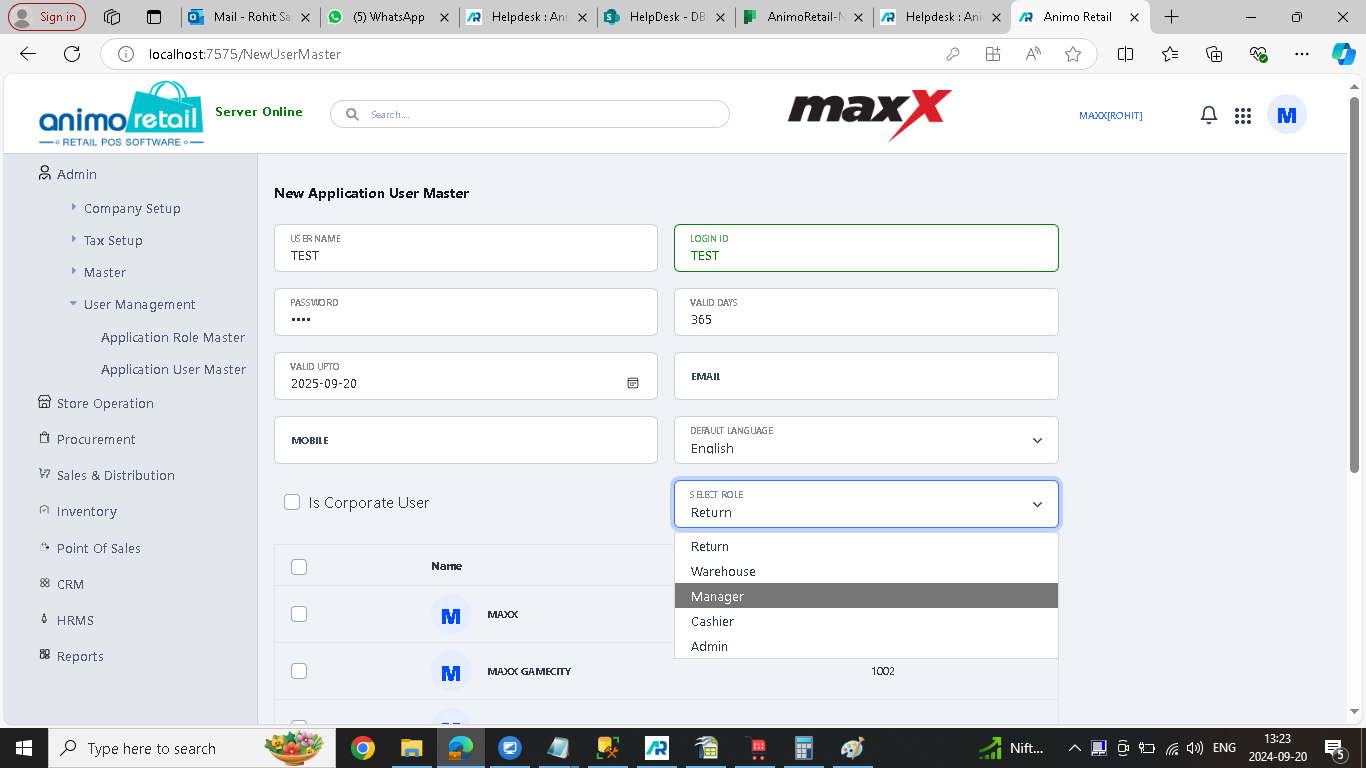 >Enter the login details like Username, Login ID and Password and select the Role in which you want to create user by click on Select Role drop down option