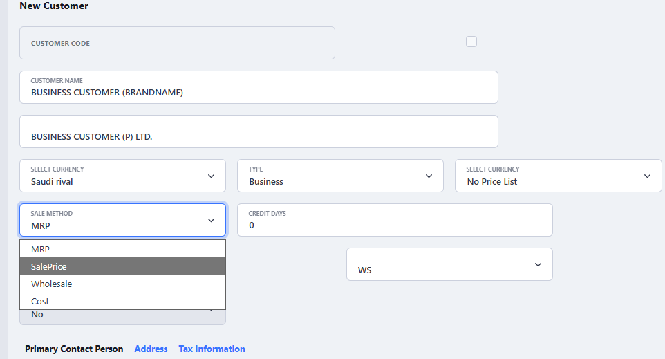 - Tax Information field to be used to save VAT or GST No of Business Customer.