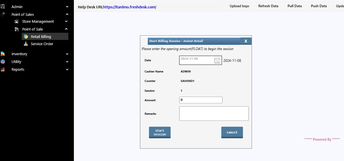 >After clicking Retail Billing function this window will appear. please enter Opening Amount and click on Start Session button.
