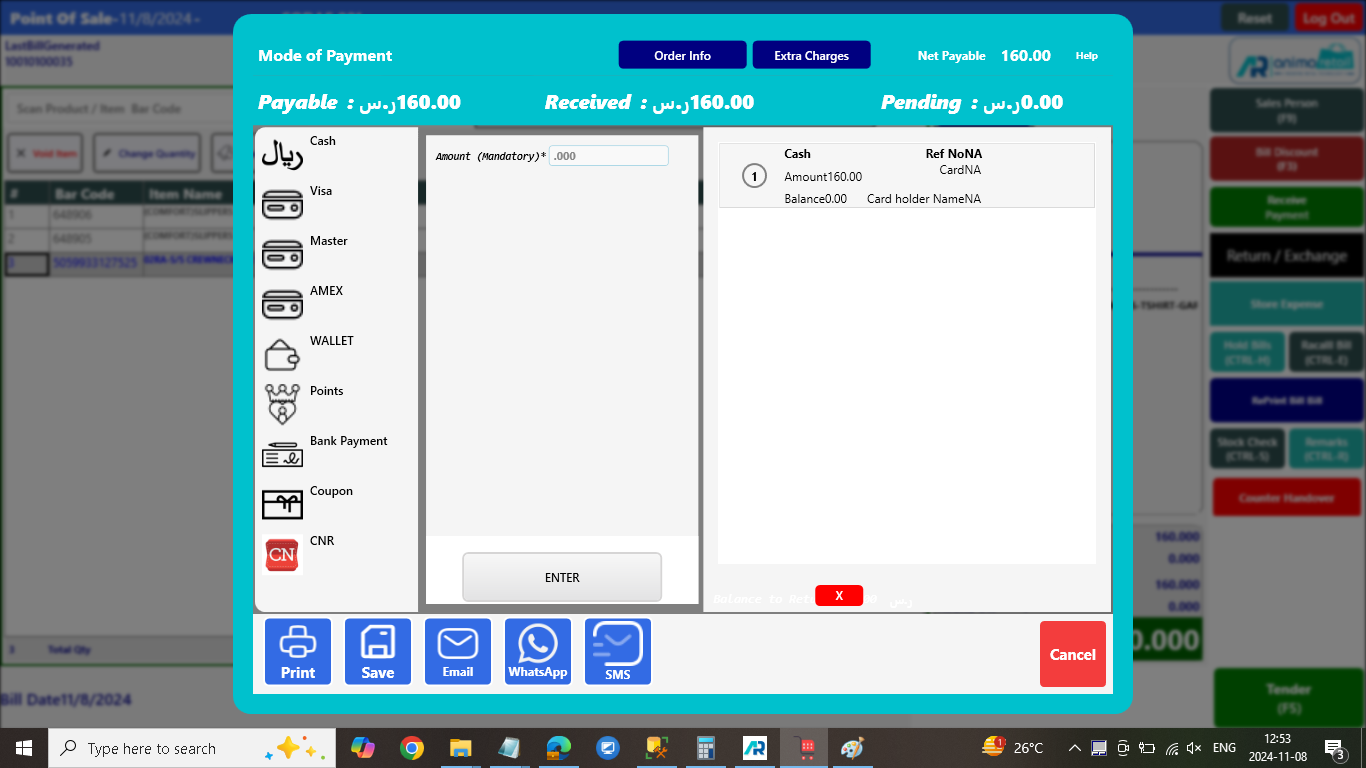 > After click on Tender Button, you will see the Tender window will appear, Select the Payment Mode and press the enter button.