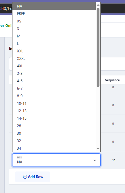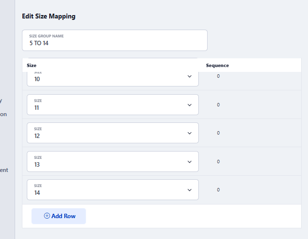 - Click on New Size Mapping to create new or click on existing size group to edit and add new sizes, Click on Add Row