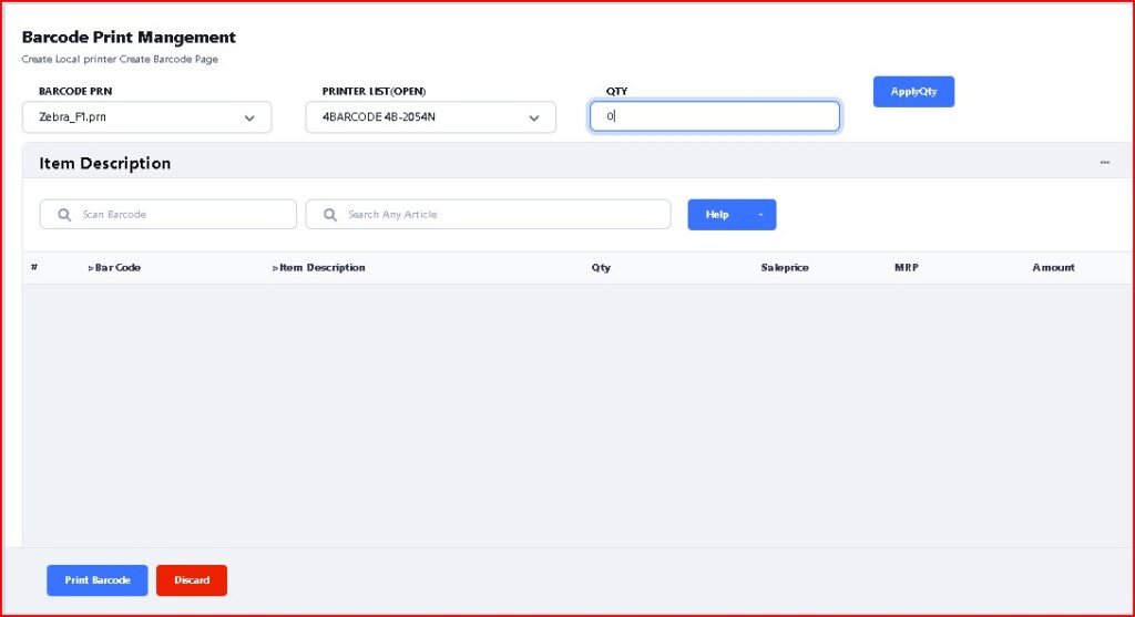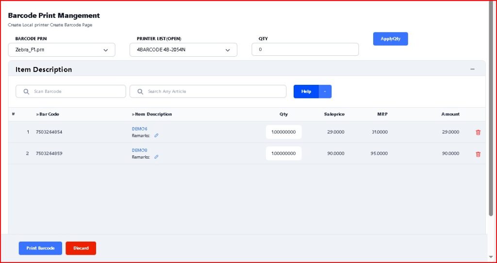 SEARCH ANY ARTICLE – In this if you do not have product barcode, then you can search by product name and select the items and print it.