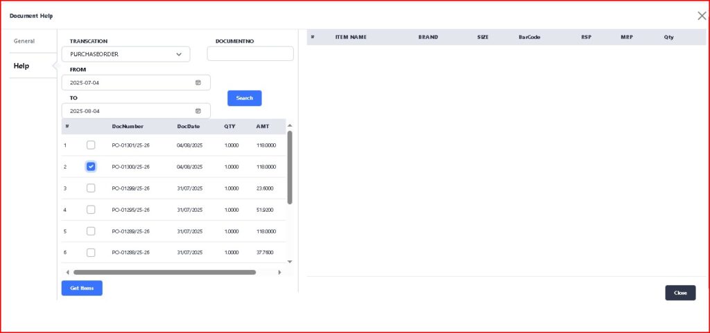 > After select Transaction and date range of document, click on Search button and select the document by click on check box in front of Doc Number. and click on Get Items button.