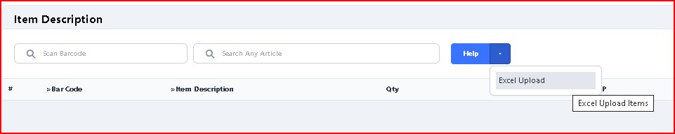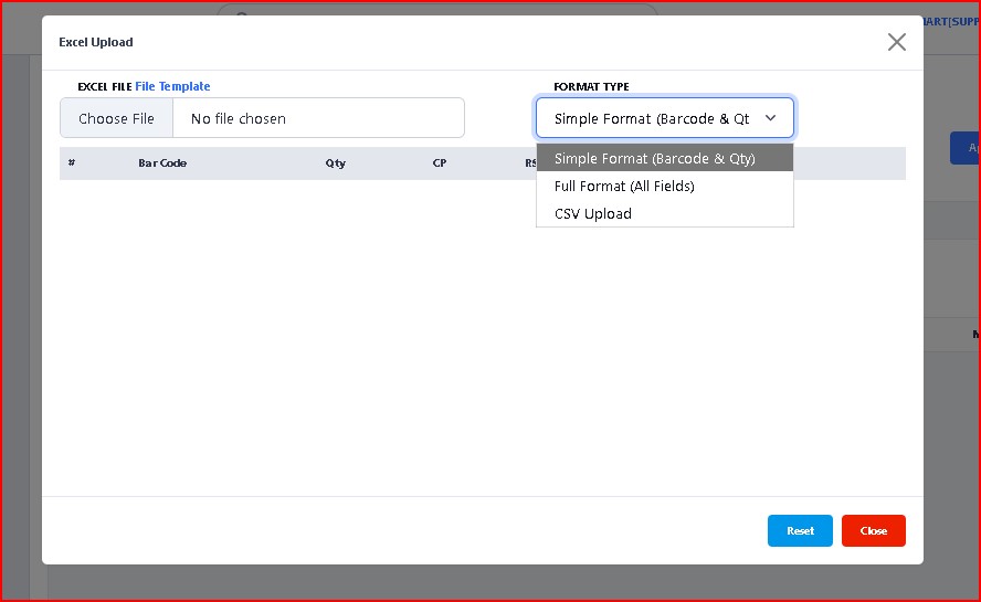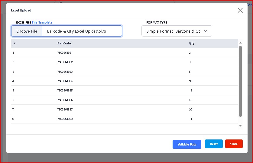 > After click Excel upload, you will see this window, select Barcode & Qty option for use excel only Barcode and Qty column wise.