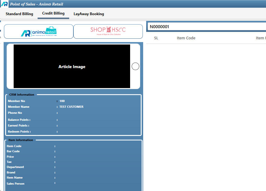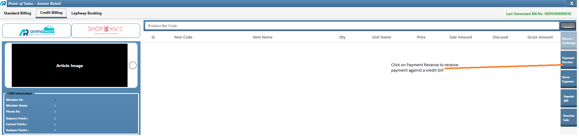 - There are three tabs available in Point of Sales Billing screen, Click on Second Tab Credit Billing which is highlighted in below image