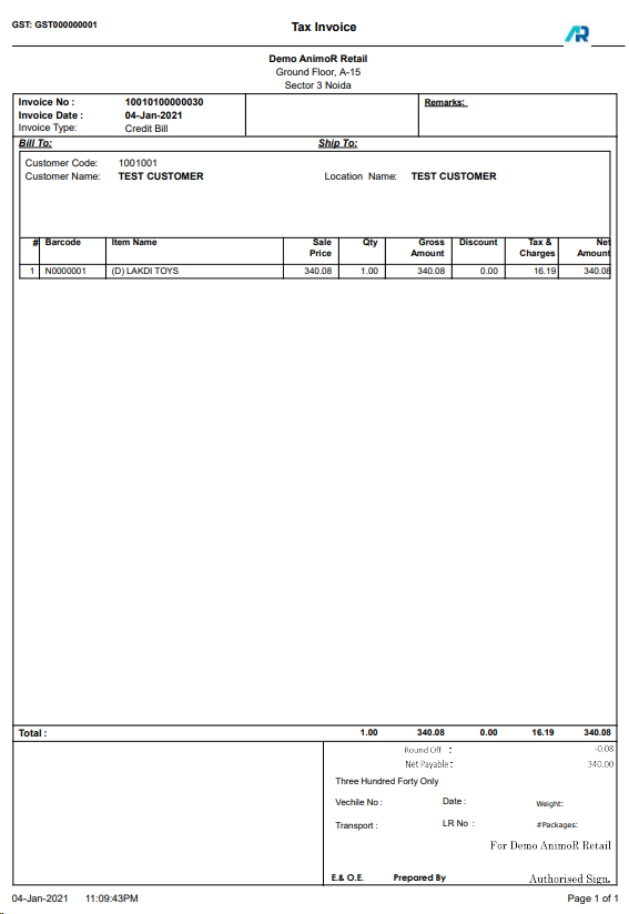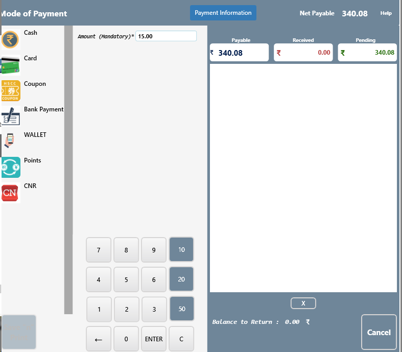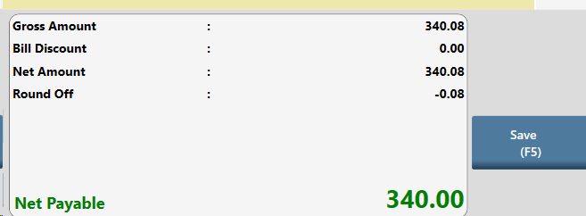 Net Payable is 340.08 and customer is paying 15.00, Press ENTER Button - Save “n” Print button will appear, click on it to save the document and print payment receipt against bill