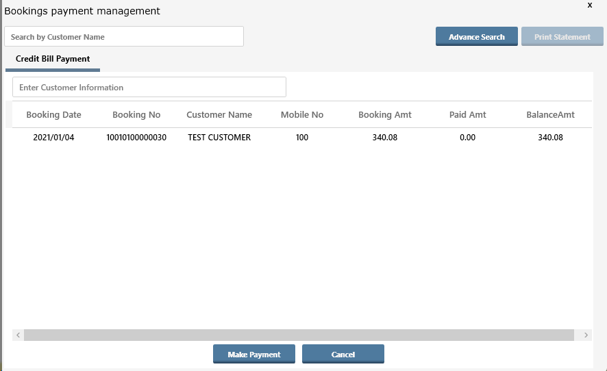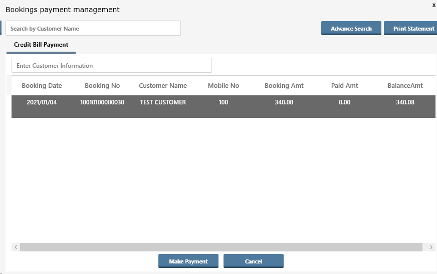 - select the row / bill from the list for which the payment has to be done, Click on button Make Payment