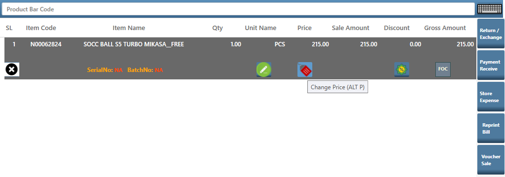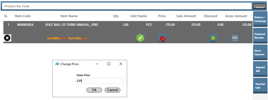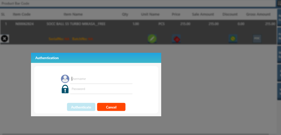 - If user is allowed to change price a dialogue box will appear if user is not allowed to change price it will ask for an authentication window which can be authorized by Supervisor or Manager