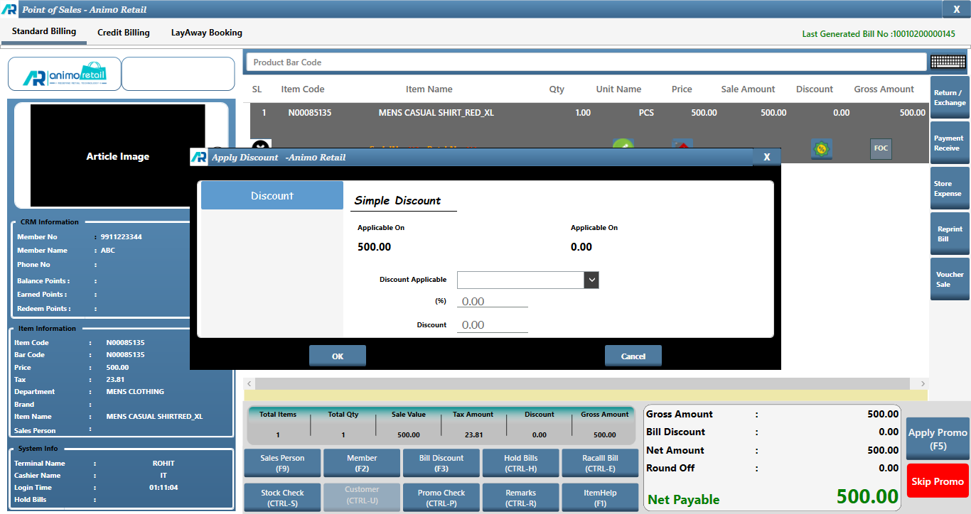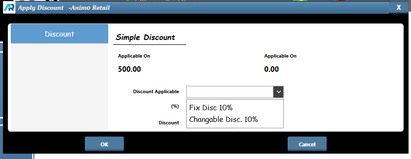 >Click on Discount Applicable drop down, there are two option first is Fix Dis 10% or second is Changable Disc %, If you want to give fix disc then you select Fix Disc 10% option, if you want to give any other discount percentage then you select Changable Disc option.