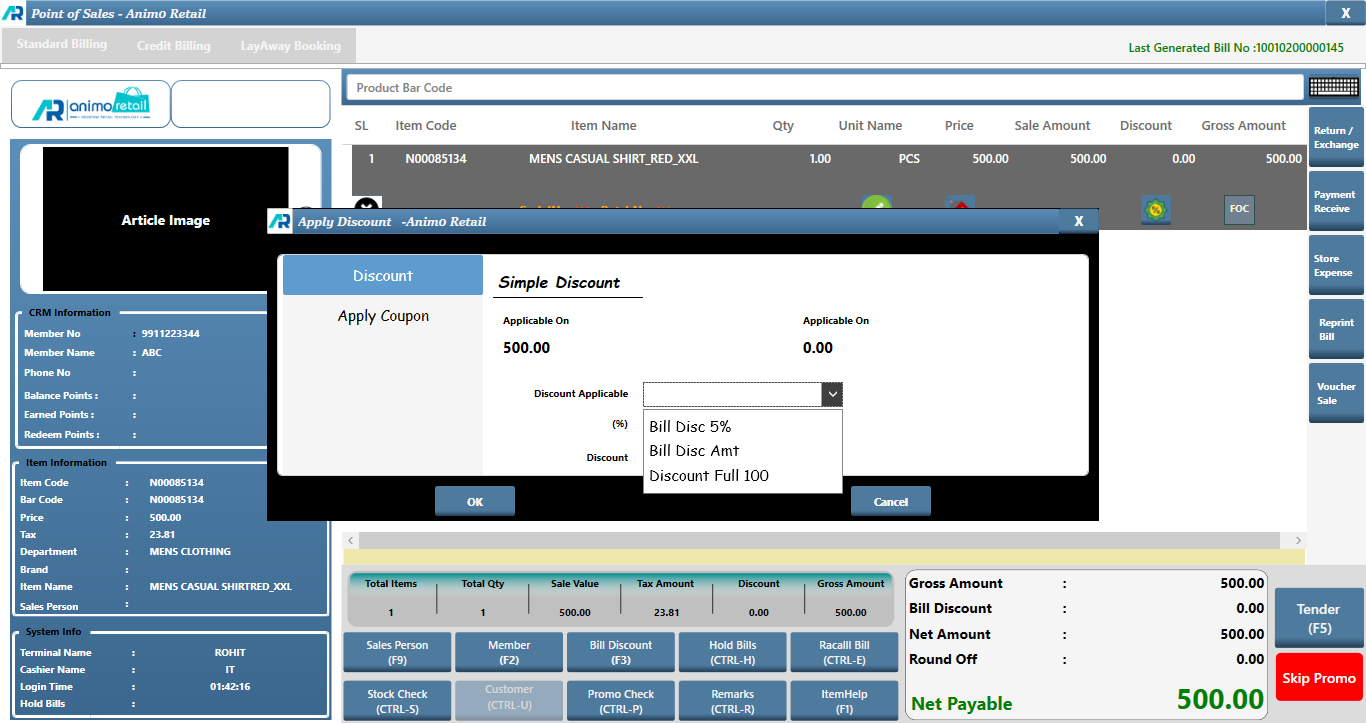 >Click on Discount Applicable drop down, select the option which discount you want to give, if you want to give percentage wise then select Bill Disc % option and if you want to give Amount wise discount then you select Bill Disc Amt Wise option.