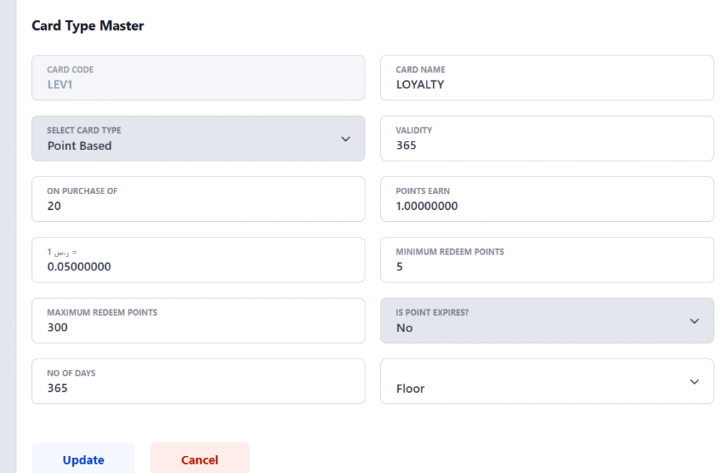 - For spent of every 20-riyal loyalty member get 1 point so suppose a customer bought something for 250 Riyal then he/she will be getting the 12.5 points