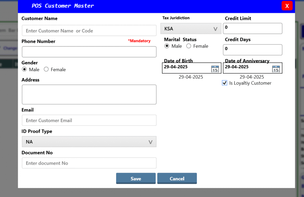 Following is an interface to edit CRM Customer Information of the customer, please note CRM Customer is independent from POS Customer Master but it is associated with POS Customer, so when you tag POS Customer in Billing Interface system will automatically pick the information of Loyalty master.