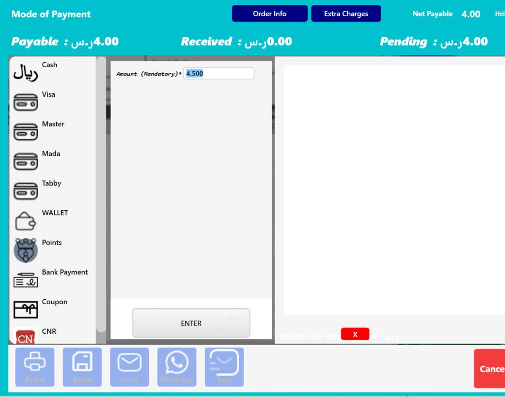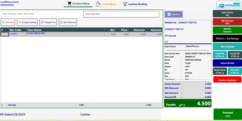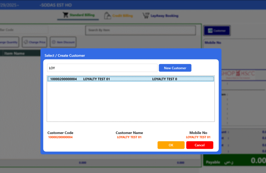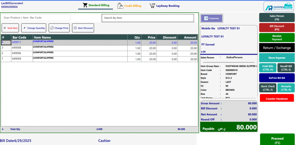 Once customer is tagged scan the items to be sold to customer and you will be able to see points to be earn based on Points Earn Logic. like in below interface you can see it is 4 points against 80 Riyal Purchase.