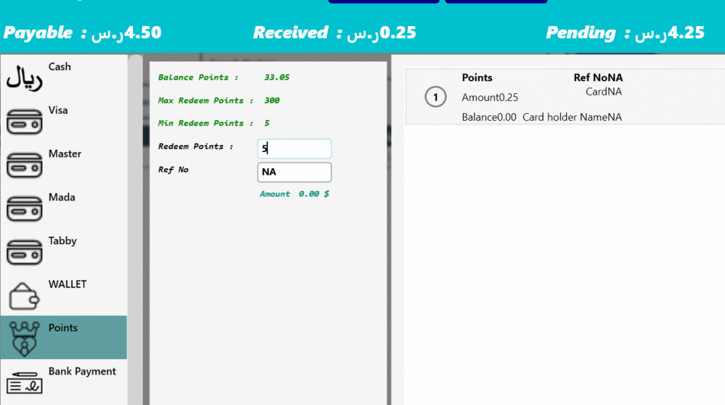 Choose Loyalty Points in Tender List, for example user is redeeming 5 points of customer in below interface which is equivalent to 0.25 Riyal, since payable was 4.5 now remaining payable is 4.25