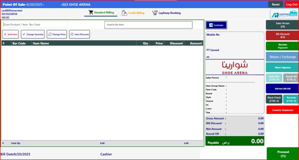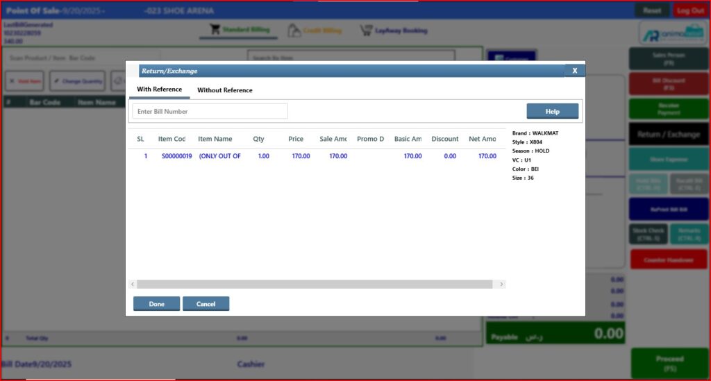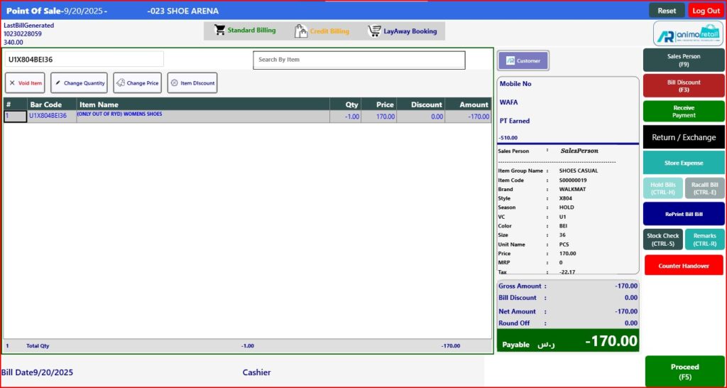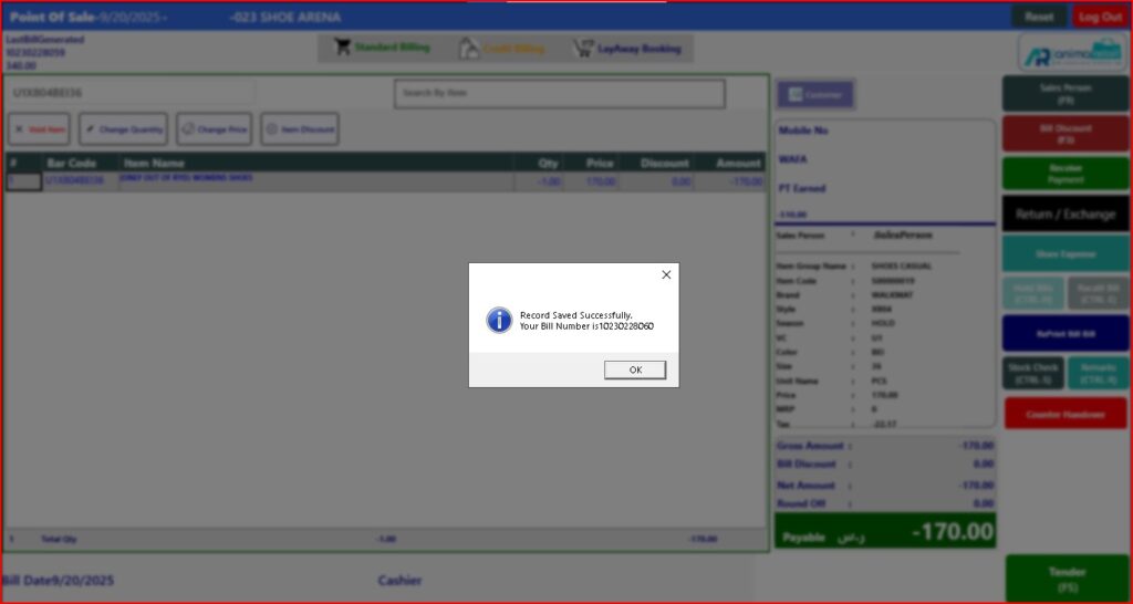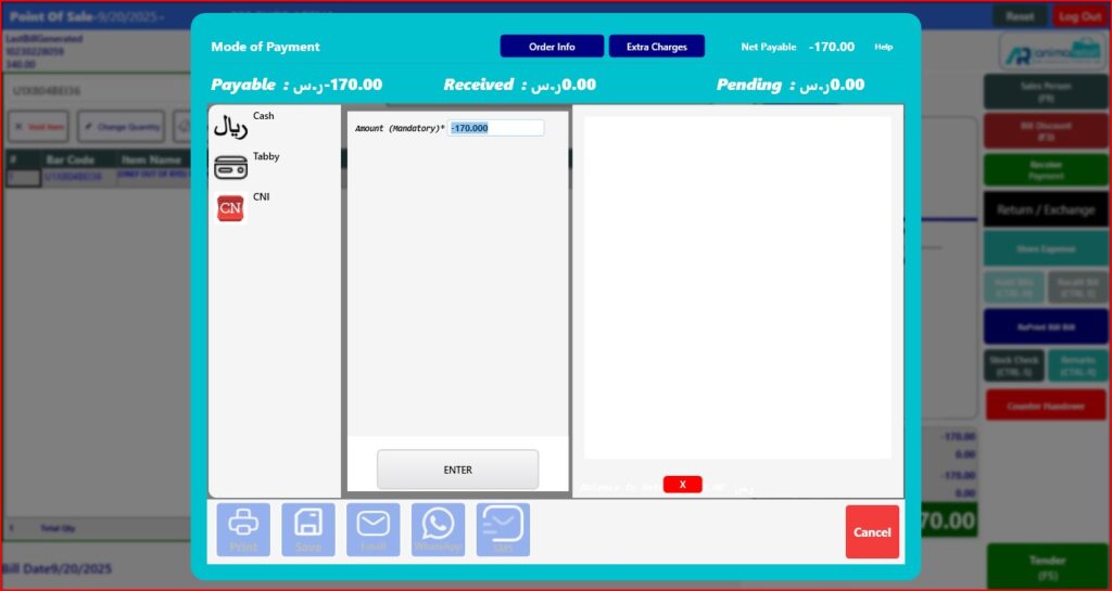 > After click on Done button, you will see the return item and quantity showing in billing screen, now open tender window.