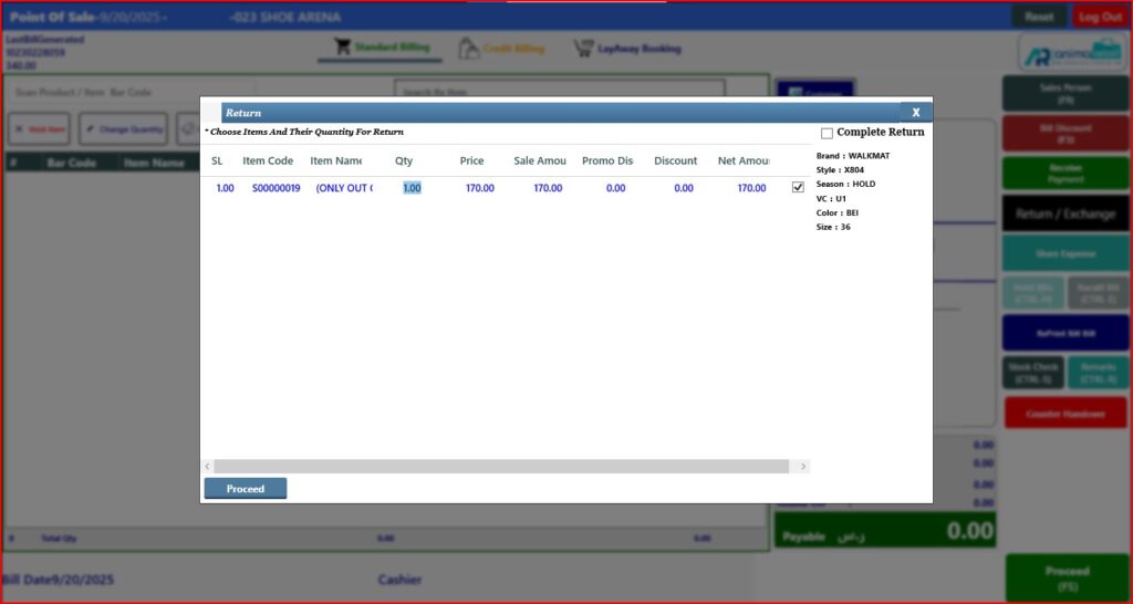 > After click on Proceed button, you will see this window, just click on check box to select the item and click on Qty option to change the qty as you want to return just click and enter the value, (remember you can put quantity either equal to sale quantity or less then sale quantity you can’t enter more than sale quantity, if you enter more than sale quantity in qty option application will not allowed. Now click on Proceed button.