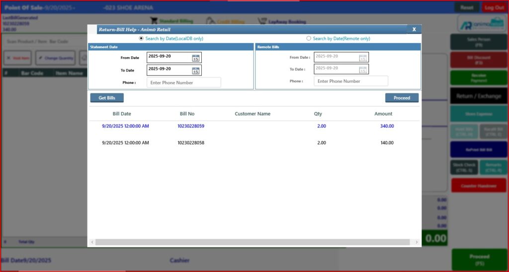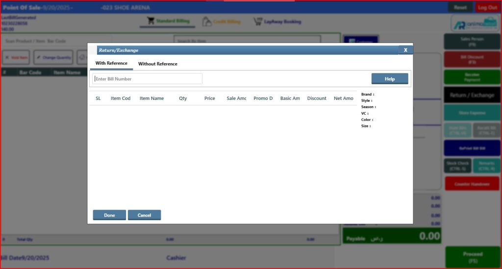 > After click on Done button, you will see the return item and quantity showing in billing screen, now open tender window.