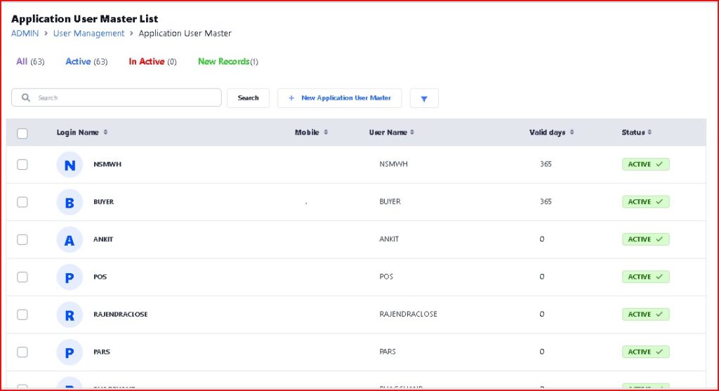 > First click on User Master interface, after open, click on New Application User Master button to create new user.